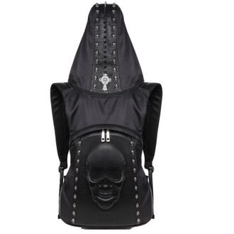 Необычный рюкзак с капюшоном, выполнен из сочетания экокожи, и полиестэра с антиводной пропиткой - защитой от дождя. Украшен металлическими черепами, а капюшон ещё и шипами.