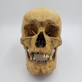 Гиперреалистичная модель черепа человека в масштабе 1:1, мужской. Материал черепа лёгкий и прочный, исключительно точно повторяющий настоящий череп человека до мельчайших деталей. Окрашен вручную с высокой реалистичностью под настоящий оттенок костей черепа. Зубы отлиты отдельно и вклеены. Нижняя челюсть - отдельный элемент. Цвет каждого изделия может незначительно отличаться от изображения.