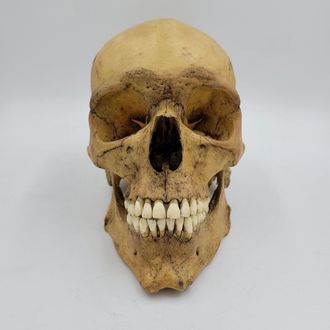 Гиперреалистичная модель черепа человека, мужской европейский «Ариец» офицер. Харизматичный большой мужской череп в масштабе 1:1 Материал черепа лёгкий и прочный, исключительно точно повторяющий настоящий череп человека до мельчайших деталей. Окрашен вручную с высокой реалистичностью под настоящий оттенок костей. Зубы отлиты отдельно и вклеены. Нижняя челюсть - отдельный элемент.