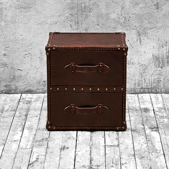 Стильная тумбочка в виде винтажного сундука в стиле Loft имеет два ящика оснащённых доводчиками и декоративными элементами в виде металла и заклёпок. Такой красивый дизайнерский элемент отлично подчеркнёт брутальный стиль в интерьере.