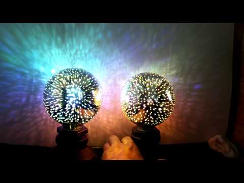 Этот LED-светильник изготовлен в виде классической лампы накаливания или её светодиодного аналога, однако отличается от неё как размерами, так и внутренним наполнением. При взгляде на включенную лампу создаётся впечатление, что внутри неё взорвался настоящий миниатюрный фейерверк, состоящий из множества цветных пятен устремлённых от центра к периферии. Выглядит очень красиво!