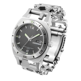 Leatherman Tread Tempo — это не только надежные и качественные часы, но еще и браслет-мультитул, содержащий 30 инструментов. Многофункциональное изделие выполнено из закаленной нержавеющей стали и оснащено долговечным швейцарским механизмом. Стильный корпус часов надежно защищен от негативного воздействия воды и способен выдерживать погружение на глубину до 200 метров. Прочное сапфировое стекло с антибликовым эффектом отличается высокой устойчивостью к царапинам. Благодаря люминесцентному покрытию стрелки и деления длительное время светятся в темноте.