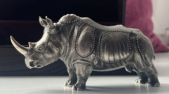 Эксклюзивная скульптура носорога в доспехах, выполнена мастером виртуозом из серебра 930 пробы. Тщательная проработка деталей и соблюдений пропорций делают статуэтку восторгом для глаз.