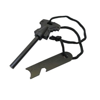 Небольшой мультитул на прочном шнуре - представляет собой кресало и линейку. Объёмная рукоятка удобна для силовой работы, а значит для высекания искр. В торце предусмотрено кольцо для подвешивания на шнур.