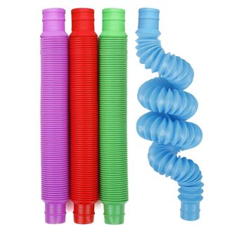 Отличным подарком детям станет Трубка-гармошка Pop tube. Эта трубочка способна растягиваться и увеличивать свою длину в 4 раза больше начальной. При растягивании трубка-слинки издает веселые звуки и может принимать забавные формы. Можно соединить несколько таких трубочек между собой и получить огромную трубку-шланг в несколько метров. Дети придумывает невероятное количество игр с таким приспособлением. Создают невероятные конструкции для передачи звуков, подведения воды или перекатывания шариков. Для воспроизведения свистящего звука необходимо совершать быстрые вращательные движения, держа телескопическую трубку в руке за один из краев.