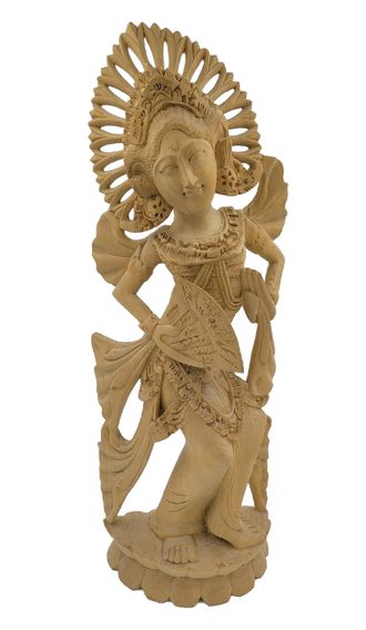 Фигурка «Балийская танцовщица» - это молодая девушка в национальном костюме, исполняющая один из народных индонезийских танцев. На ее голове – кокошник с длинными острыми украшениями, символизирующими солнечные лучи, на груди – небольшая попона с матерчатыми крылышками, в руках – традиционный веер.